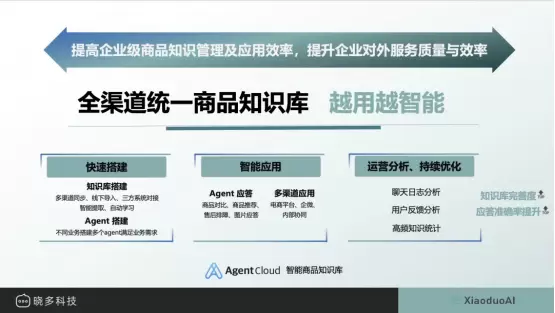 岗中阶段,精准洞察并满足用户需求,是对智能客服能力的终极试炼。而传统机器人将产品信息配置成表格后读取的做法不仅调用时间长,多个售卖渠道配置表也须分别维护,成本极高。晓多科技推出的“多策”全渠道智能知识库,依托大模型,一键部署,全面覆盖,以智能化、自动化手段显著提升客服效率。