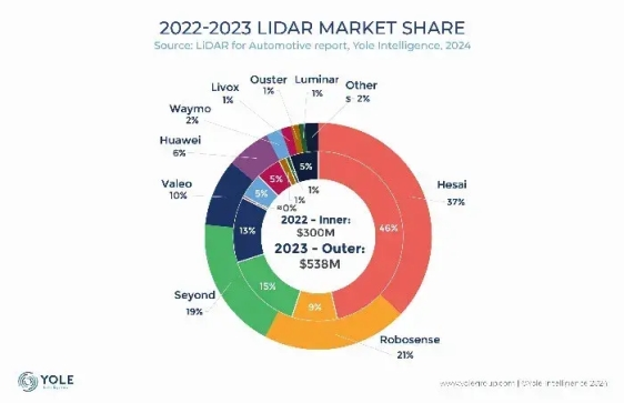 目前,Seyond图达通车规量产超远距主视激光雷达猎鹰(Falcon)已作为蔚来NT2.0平台的Aquila超感系统标配量产交付,搭载于ET7、ET5、ES7、ES8、EC7、ES6、ET5T、EC6等多款车型上。据Yole和盖世汽车数据,2022年图达通激光雷达全球市占率达15%,2023年提升到了19%。