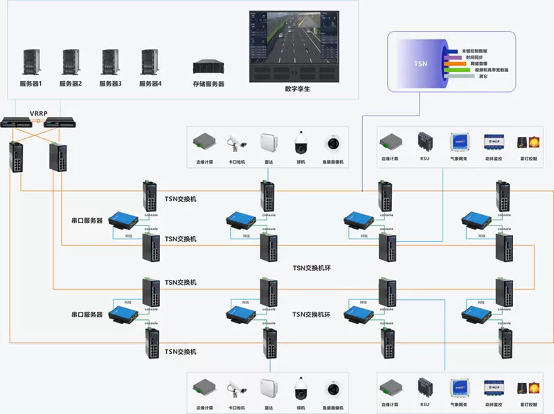 三旺通信采用TSN确定性网络+工业级交换机双环组网方案,助力系统7×24小时实时监测。TSN环网用于传输雷达、视频、边缘计算、远程控制信号等数据。数据的类型呈现多样化,TSN解决方案依托高性能以太网,基于时间流量调度机制等特点,实现并网传输,一张网络完成多业务统一承载。