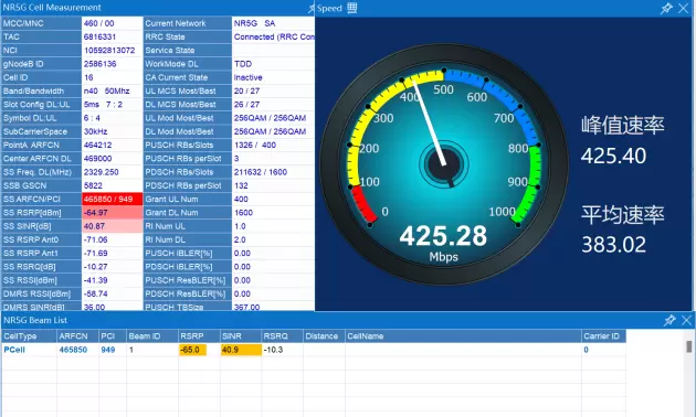 本次试点选在济南欧亚大观商场,该商场为大型购物商业中心,人流量大,5G网络负荷较高,设备采用中兴通讯最新双频设备R9626 M2326 2通道RRU,同时支持2.6GHz和2.3GHz,具备带宽大、功率高等特点,在原室内天馈系统基础上通过硬件设备替换、软件版本升级以及性能参数调试,在2通道@50M带宽组网下,下行峰值速率达到425Mbps,相比E频段4G网络速率提升5倍以上,充分发挥了5G技术优势,极大缓解网络容量压力。