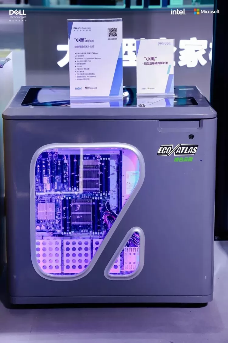 在大会上,戴尔重点展示了在构建绿色数据中心方面的最新成果,比如在AI超强算力展区的“小黑”——绿色云图边缘浸没式液冷机柜,引起许多参观者驻足观看。