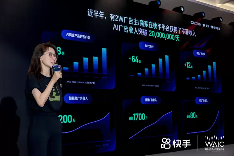 快手商业化外循环和AI商业产品负责人刘逍透露,半年来,有近2万商家在快手平台借助大模型能力实现智能化经营,获得不菲回报。相比今年1月,今年6月的AIGC月活跃客户数增长了8倍,月GMV规模提升了64倍,平台AIGC广告收入规模提升了12倍。刘逍表示,磁力开创、女娲数字人、π数字员工等“新生意”工具将持续为商家深度赋能,“我们将继续深化AI技术在商业化中的应用,不断创新和发展,为客户创造更多价值。”