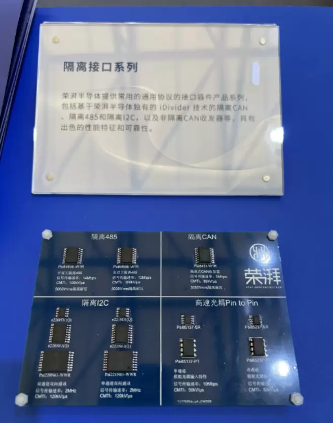 采访伊始,吴经理为我们简单介绍了本次荣湃半导体展台内的四大产品线。首先是已经赋能工业自动化及汽车电子领域的数字隔离器系列。吴经理提到,作为荣湃半导体在业内深耕多年的一大产品线,目前产品面已覆盖1.5kVrms、3kVrms、3.75kVrms、5kVrms、5.7kVrms等多个隔离电压档位,精准对接新能源车企、电机制造商等多元化客户的个性化需求。在光伏应用中已经将母线电压提高至1500V以上,这就需要更大爬电距离的隔离器件来满足国家标准GB4943.1-2022所规定的耐压性能和爬电距离要求。为此,荣湃半导体推出了增强绝缘型数字隔离器和Pai1XXE7X-WWR系列超宽体数字隔离器。荣湃超宽体数字隔离器系列产品标称耐压达5700Vrms,可重复工作耐压峰值可达2828Vpeak,满足GB4943.1-2022标准中最严苛的隔离器件抗电性能要求和客户高压系统的安规要求。