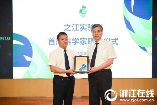 之江实验室主任朱世强为潘云鹤(右)颁发聘书