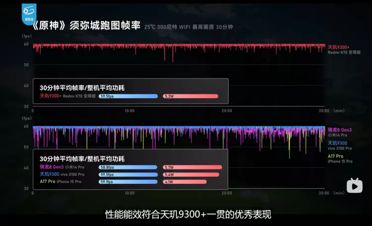 在游戏体验方面,红米 K70 至尊版以狂暴的性能和优秀的能效展现了恐怖的统治力,绝对是同级中手游玩家的最强福音。在热门游戏《原神》须弥城跑图帧率测试中,最高画质设置下跑30分钟,搭载天玑9300+的红米 K70至尊版帧率达到59.5fps接近满帧,功耗仅有5.3W,无论是帧率还是能效都是安卓第一的存在。
