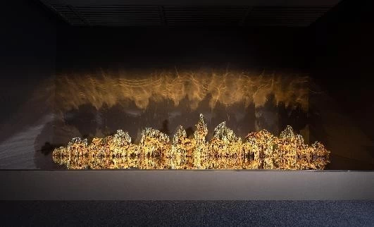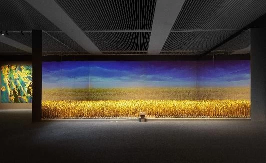 步入展厅,彷佛进入了一个“铜话”的世界。展览中,中国第一座彩色铜雕宝塔——雷峰塔的建筑艺术品,第一座铜桥“涌金桥”,及代表中国铜壁画创作高峰的《万泉归海》等经典作品细数亮相。国博珍藏的熔铜艺术开山之作——《阙立》,时隔十七年再次与观众见面,与《稻可道,非常稻》《千里江山》《燃烧的向日葵》等作品,共同演绎了一场形意交织的双重盛宴。