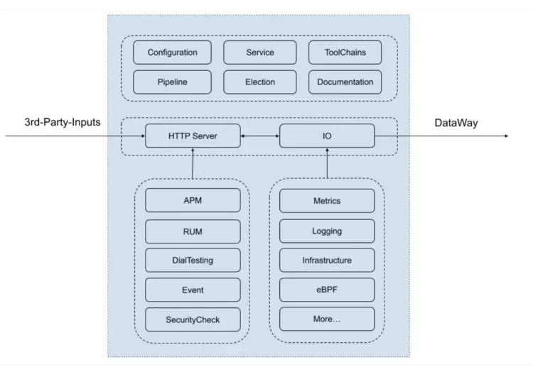 观测云的 Agent 模型采用了类似 OpenTelemetry 的架构,将 Instrumentor(探针)和 Collector(Agent)分离,完全不同于传统的 APM 厂商。
