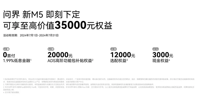 值此暑期出游之际,问界新M5更是推出了多重购车优惠政策。售价24.98万-27.98万元的问界新M5,即刻下定,可享至高价值35000元的权益,涵盖20000元ADS高阶功能包补贴、12000元选配权益,3000元现金权益;更有0首付、1.99%低息金融方案,让每一位消费者都能轻松拿下的“自驾出游好搭子”。