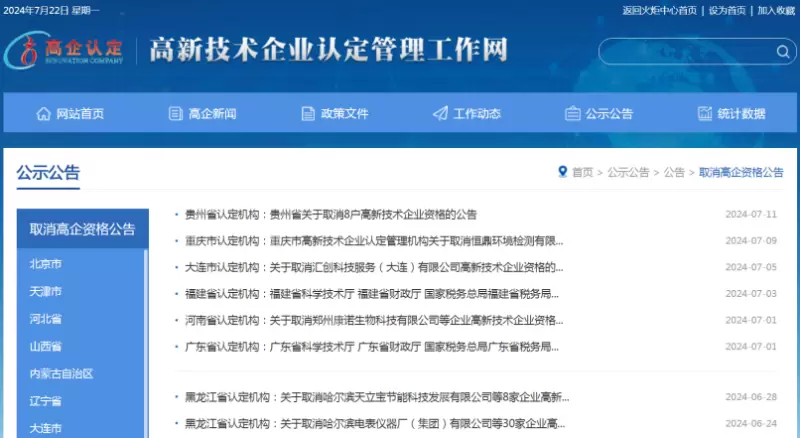 据统计,仅2024年上半年,就有近2000家企业被取消了高新技术企业资格,其中江西省一次性取消了近900家高新技术企业,广东(含深圳)、黑龙江、重庆、湖北、贵州、安徽、青岛等各地也取消了上百家高新技术企业。