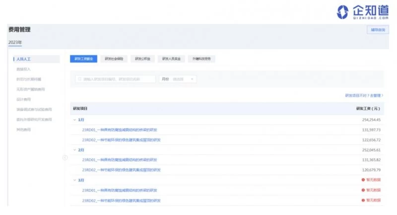 研发费用管理系统提供涵盖多个方面的费用管理,包括人员人工、直接投入、折旧与长期待摊、无形资产摊销费用、设计费用等,企业还可查看每个研发项目的人员和支出信息。