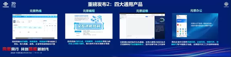 依托实际场景中的共性需求,发布了四大标准通用产品,可以进行跨行业复制,包括:元景热线(提供具备知识辅助、智能填单、智能派单等功能的工具包,助力客服、政务、企业等热线智能化升级)、元景编程(提供具备代码生成、代码解释、自动优化等能力的开发工具助手插件,助力软件开发实现降本增效)、元景运维(以联通在线咨询平台为基础,采用大模型/AIGC技术打造数智化IT运营服务助手,提升运维专家工作效率)、元景办公(面向企业办公提供党建百问、企业百科、创意写作、音频转写等16项助手功能,全面提升员工工作效率和体验)。