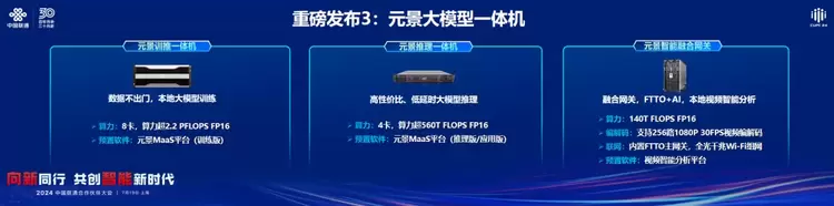 中国联通还隆重发布了元景一体机,包括元景训推一体机(预置元景MaaS训练版)、元景推理一体机(预置元景MaaS推理版或应用版)和元景智能融合网关(预置元景视频分析平台),提供算力及预置软件。做到数据不出门即可进行本地大模型推理及训练,有效提升服务效能和用户体验。