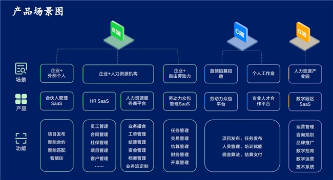 云平台是集数字化管理系统、数字化众包平台和平台运营服务三维一体的综合性智慧用工平台。在满足HRSaaS常规需求的基础上,将众包管理和合伙人管理纳入到企业传统人力资源管理体系中,通过云平台实现对多种用工模式的一体化管理,从而充分发挥自由职业者的个人价值,实现社会化人力资源的最大价值。产品全面覆盖G端、B端以及C端三端不同的需求。
