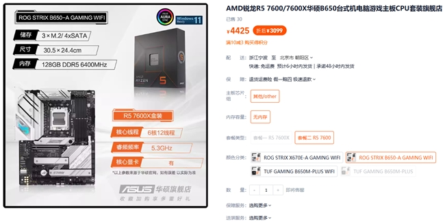 且天猫商城还有华硕B650吹雪主板搭R5 7600处理器套包,活动价3099元。