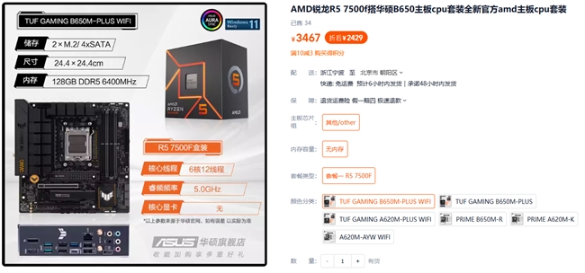 且天猫商城还有华硕B650重炮手WIFI主板搭R5 7500F处理器套包,活动价2429元。