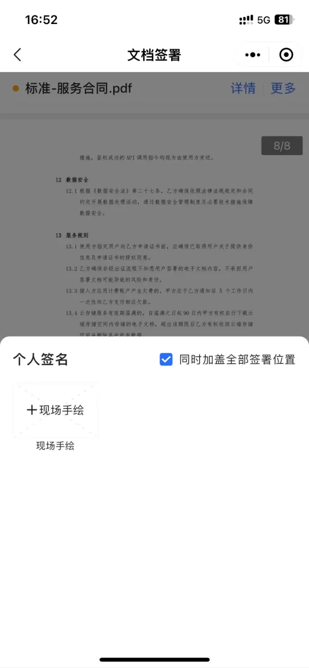 1. 阅读完合同后提交签署,选择现场手绘。