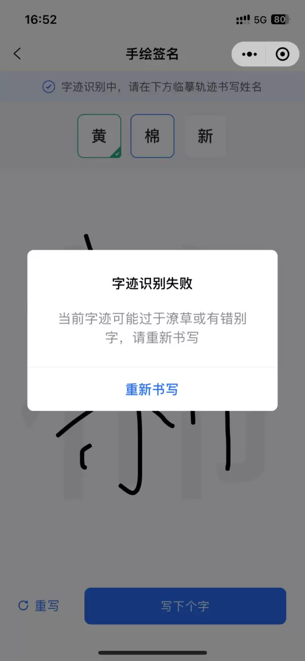 3.字迹录入过于潦草或有错别字时,提示字迹识别失败,需重新书写。
