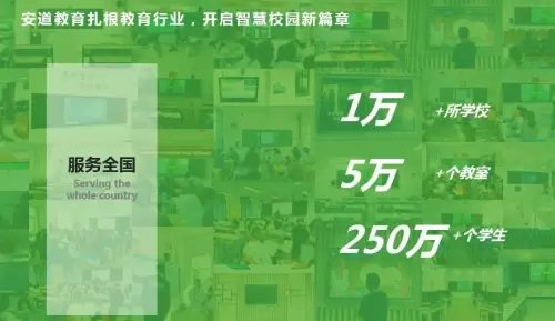 3、服务升级,影响深远。安道教育的服务已覆盖超过10000所学校、50000间教室,影响了60000名教师和2500000名学生的教育生活。这些数字,不仅展示了安道教育的交付能力,更体现了其在教育行业中的领导地位。
