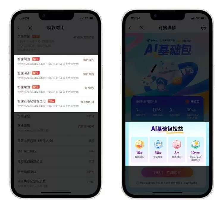 随着天翼云盘App V10.2.1的升级,目前天翼云盘黄金/铂金会员也同步升级为天翼云盘 AI 黄金/铂金会员,叠加了 AI 基础权益包,用户可每月免费尊享智能搜图5 0次、智能问答 10 次、智能绘图三次和 10 分钟智能云笔记语音速记。