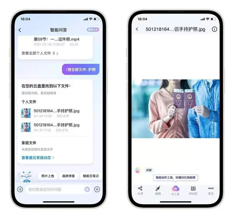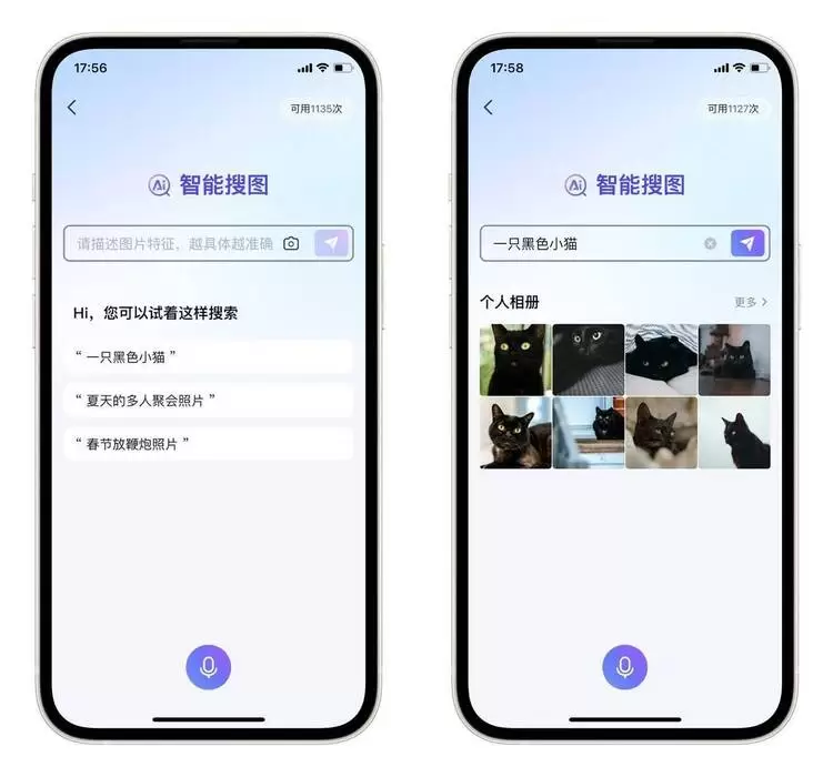 智能搜图。智能搜图功能基于 AI 模型技术与检索算法,为用户提供智能化的搜图服务。用户只需通过在对话框输入“家庭老照片”,就能轻松找回那些珍贵的回忆;或者上传一张本地照片,即可快速搜索到更多相似的照片。这一功能避免了用户在相册中繁复查找的困扰,为用户带来省时省力、轻松便捷的智能化服务体验。