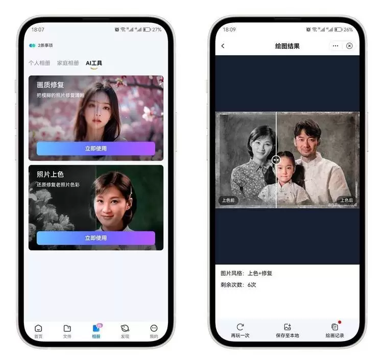 智能绘图:用户可以选择本地或云端照片,对照片进行画质修复或上色,让照片焕发新生,重拾过往时光中的温情故事。其中,“画质修复”通过 AI 视觉大模型,对模糊照片、低分辨率照片进行高清化处理,让照片中的每一位人像都清晰重现,带你感受多年前那一刻的温暖与感动;而“照片上色”功能还能对老旧褪色照片进行上色处理,让那些珍藏的瞬间变得鲜活生动,仿佛带你穿越时空,重温那些美好的情感。