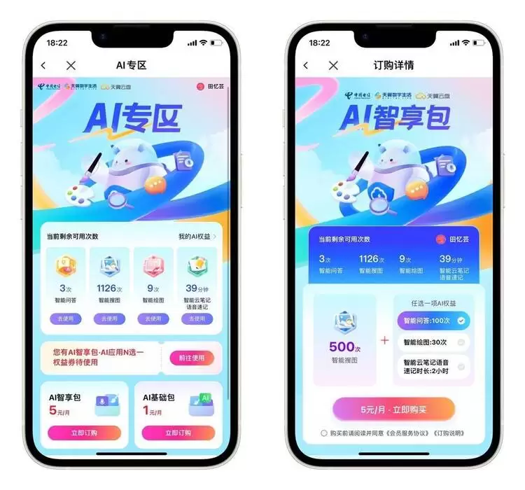 对于普通会员和重度 AI 工具使用用户,可专门订购 AI 权益包。目前天翼云盘上线了两款 AI 权益包,AI 基础包 1 元/月包含 10 次智能问答、50 次智能搜图、3 次智能绘图和 10分钟智能云笔记语音速记。AI 智享包 5 元每月包含 500 次智能搜图,以及在智能问答 100 次、智能绘图 30 次和智能云笔记语音速记 2 小时三项权益中任选一项。