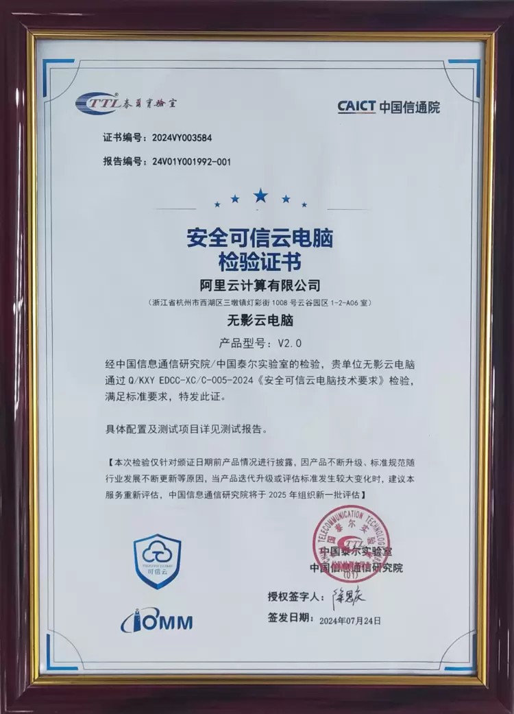 图:阿里云无影获全国首批《安全可信云电脑能力评估》认证