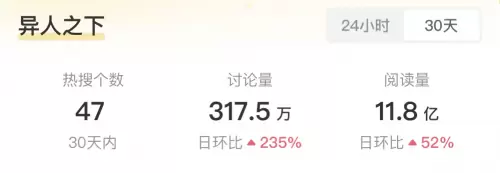 电影自定档以来热搜不断,仅微博平台,近30天几乎每天一热搜,从电影定档官宣到和电影角色相关的话题讨论,漫迷及影迷对此关注热度持续高涨。微博讨论量不断飙升至317.5万,阅读量更是猛增至11.8亿;抖音平台与#电影异人之下相关的话题层出不穷,总播放量直接突破27.5亿次。直至上映当天,全网话题的热度仍在持续攀高。