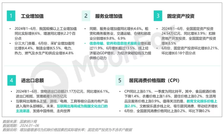 2024年上半年,国内生产总值(GDP)达61.68万亿元,按不变价格计算,同比增长5.0%。分产业看,第一产业增加值3.07万亿元,同比增长3.5%;第二产业增加值23.65万亿元,增长5.8%;第三产业增加值34.96万亿元,增长4.6%。分季度看,Q1我国GDP同比增长5.3%;Q2同比增长4.7%、环比增长0.7%。