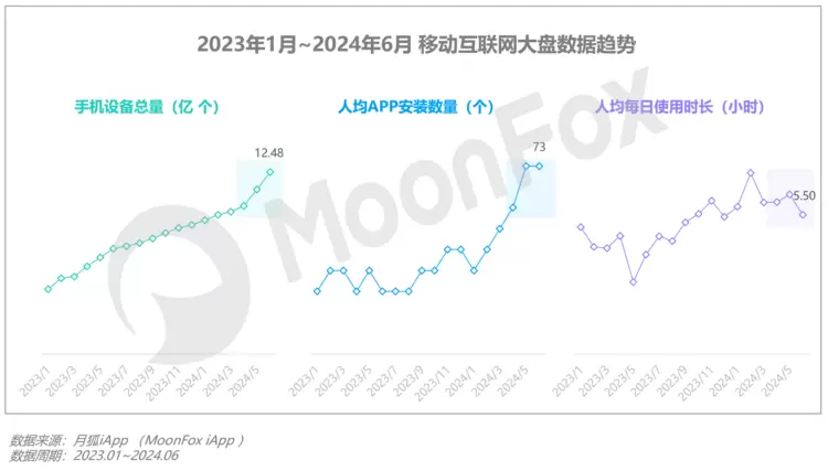 安装量方面,自2024年1月起,人均App安装数量稳步走高,于5~6月稳定在73个。结合CNNIC数据,当下我国在架App数量已超260万个,实用工具、移动游戏类产品份额走高;各类产品已逐步适配老年、儿童使用习惯及需求,下载需求迸发。