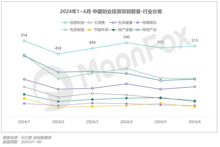 行业来看,信息科技仍为资本关注的主要标的,2024年Q2,共有1,500余个相关行业项目获投,其中主要以软件、大数据等行业为主,近年来AI占比逐年提升,贡献主要增长;先进制造获投企业数量位列第二,与覆盖领域众多的传统产业基本持平,半导体、机器人、汽车为先进制造行业中的头部获投行业;最后,诸如传媒、地产金融等表现低迷,其市场已逐步进入存量竞争的红海阶段。