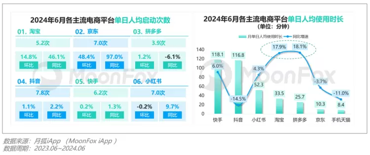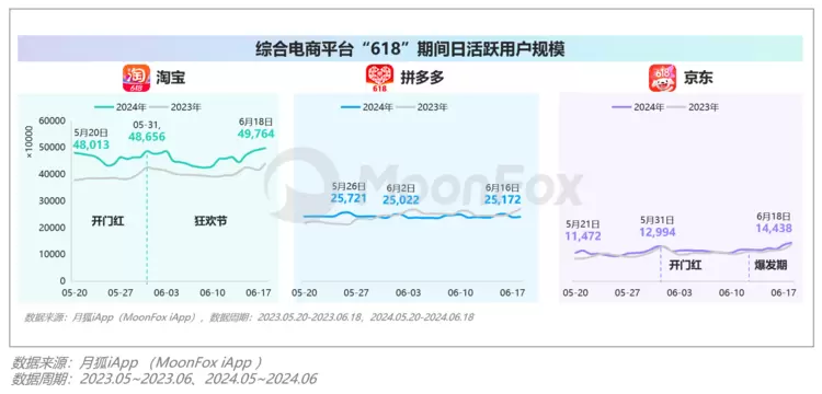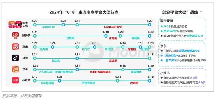 在节奏上,2024年618整体流程大幅简化,抛弃“预售、定金”等复杂玩法,头部平台均选择围绕“抢先、预热、冲刺、返厂”四大阶段安排大促,从整体时间上来看战线有所拉长,从平台表现来看,虽整体GMV增速减缓,但各家仍在细分方向上有所突破。