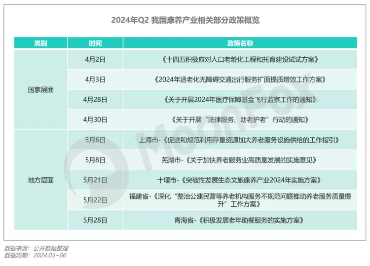 在此背景下,大量针对老年人口的相关政策出台。国家层面更多围绕养老方案、交通出行、医疗保障等宏观维度需求;地方则更关注具体产业及服务落实。不完全统计,国家及地方于2024年Q2共推出2~30项政策,高于其他季度。