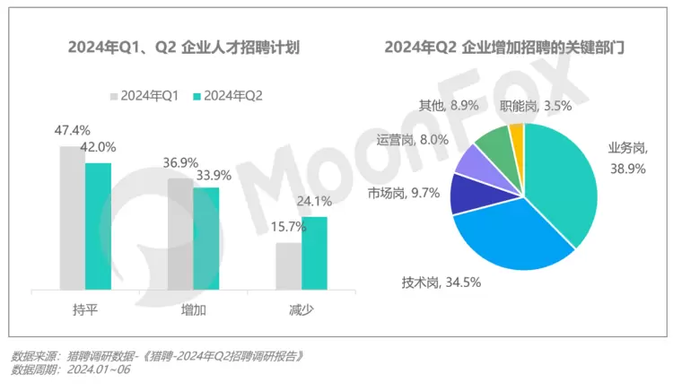 招聘方角度,2024年Q2,更多企业选择减缓纳新,据猎聘调研数据,有超24.1%的企业选择减少招聘计划。同时,从公司规模来看,300及以上规模企业于Q2加快招聘节奏,100~299人的行业“准头部梯队”企业则多选择放缓节奏,仅有超15.7%的企业选择增加人才招聘,同比下滑达10个百分点。整体来看,行情遇冷共同体现在招聘、求职双方。