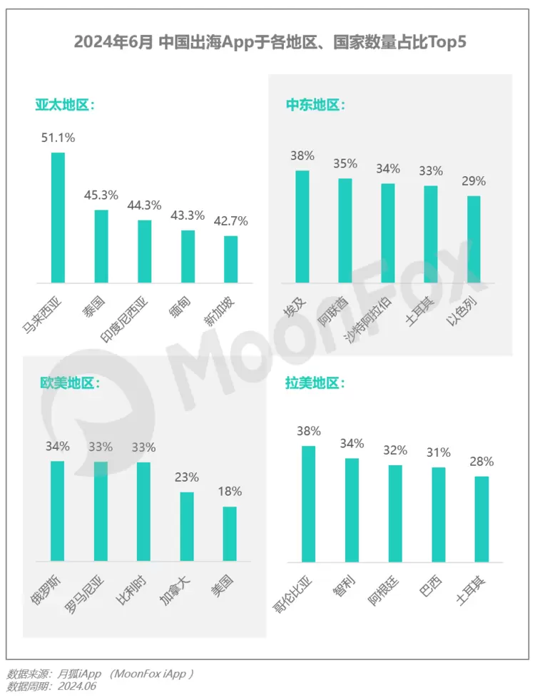 相较之下,东南亚、拉美市场门槛相对较低,出海成功率高,据月狐数据,如马来、泰国、印尼等地出海App平均渗透率可达40%~50%。