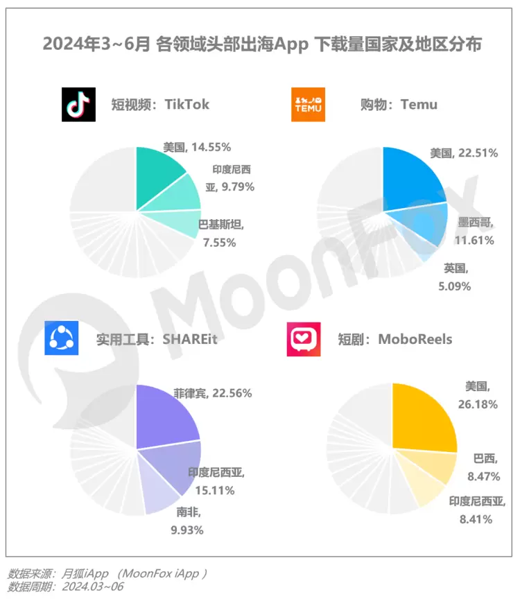 2024年Q2,我国出海App于下载量维度呈现全球化、分散布局的态势,单一市场集中率保持稳定。据月狐数据,2024年Q2,各细分领域头部出海App全球下载量地域分布较为分散,Top3占据整体比重多不足40%,同比显著提升。以Tiktok为例,其于全球超170个国家及地区上榜,覆盖全球40亿+用户群。