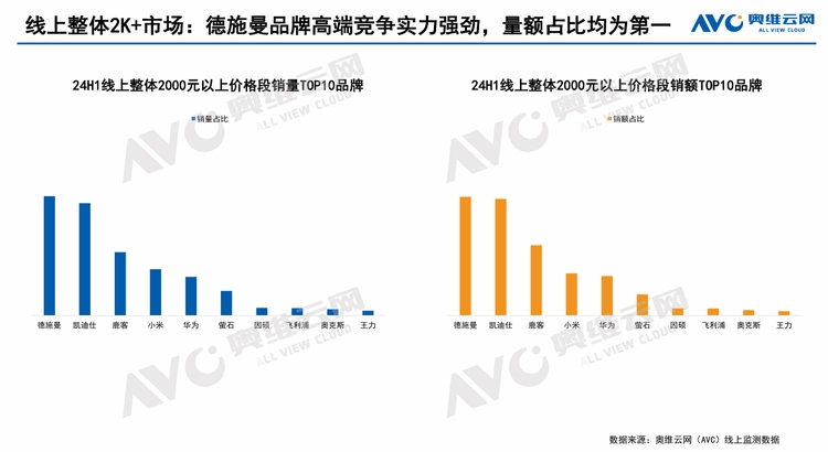 在此背景下,行业领军品牌德施曼在两份报告中均保持了线上全渠道的绝对领先,2024年上半年德施曼线上全渠道销额遥遥领先,稳居全行业第一;在2000元以上中高端市场中,德施曼销额&销量均排名第一;在抖音等新兴电商平台,德施曼销额&销量压倒式领先。