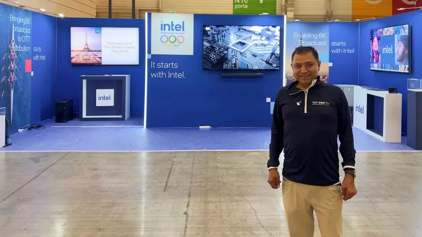 2024年巴黎奥运会开幕前,英特尔软件与先进技术事业部全球内容技术战略师兼8K项目负责人Ravindra (Ravi) Velhal 站在位于奥运村国际广播中心的公司展台上。(图片来源:英特尔公司)