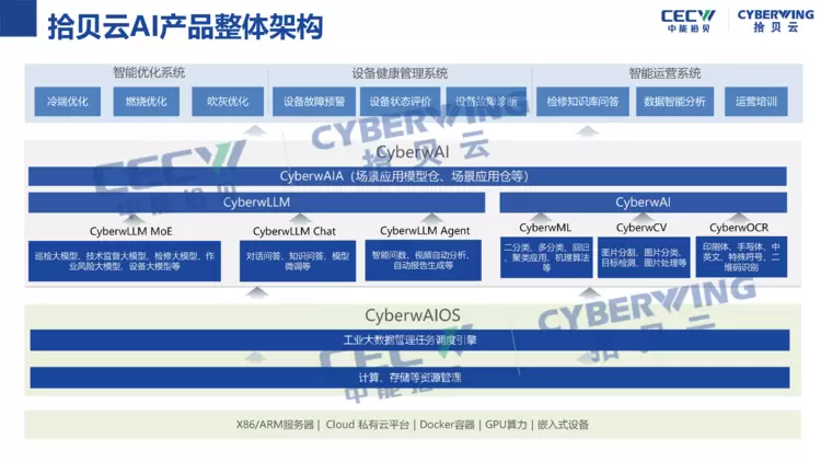 谈及中能拾贝的AI产品,他介绍了拾贝云AI产品整体架构、拾贝云CyberwML产品、拾贝云CyberwCV产品、拾贝云CyberwLLM产品。基于拾贝云大模型的整体能力,中能拾贝在助力数字化电厂建设智能优化系统、设备健康管理系统、智能运营系统等领域均有丰富实践。