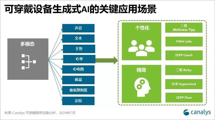 Canalys《AI手机的现在和未来》报告中,我们明确了生成式AI应用场景的三大趋势:多模态、个性化和精简化。这些趋势也同样适用于可穿戴设备的生成式AI。但是,鉴于硬件的差异以及可穿戴设备的对于特定应用场景的专注,在某些特定的AI功能方面可能会存在细微差别。