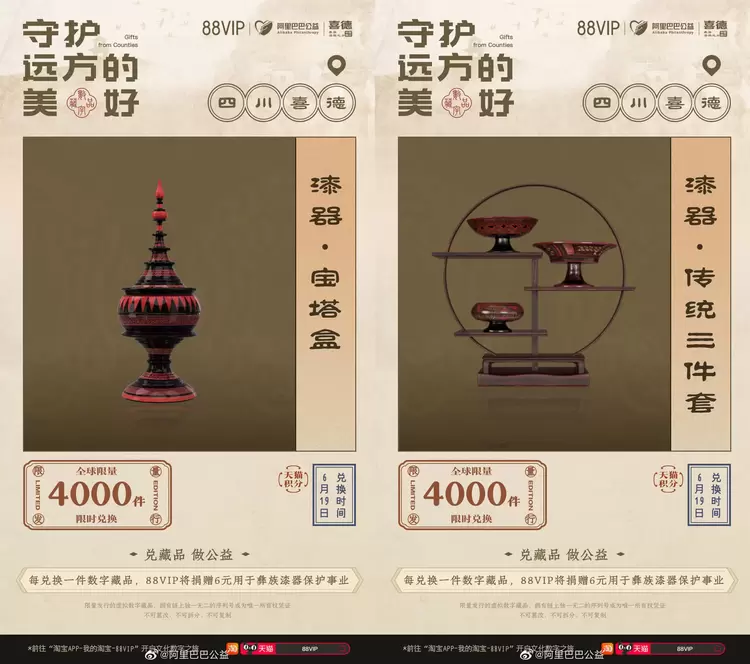 用户可以通过会员积分在淘宝88vip平台兑换这些数字藏品,每兑换一个,由平台捐赠6元用于彝族漆器保护项目。