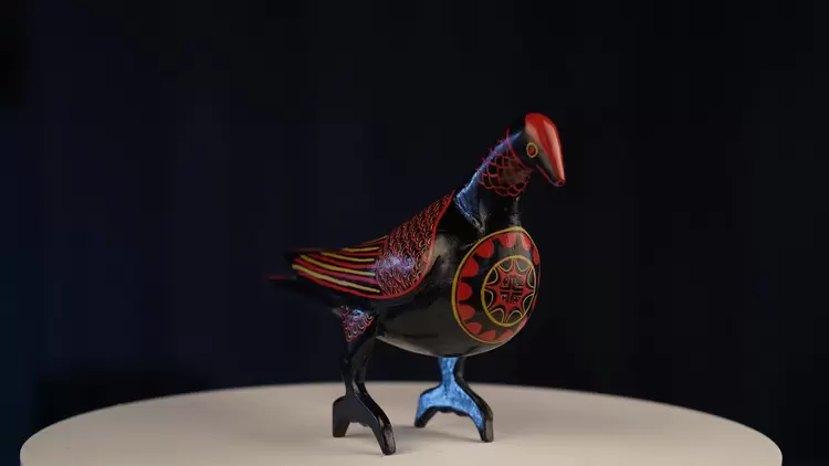 鸽形酒壶是彝族漆器中的经典器具,既可以作为装饰品,也可以用于装载酒液,表面纹路细节较复杂,主要由细密的鱼鳞纹和丰富的格纹绘制而成,壶身几何形状不规则、黑亮面较多。