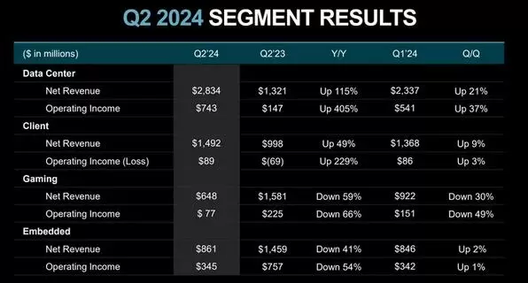 (AI云资讯消息)AMD今日刚刚公布了其 2024 年第二季度的财报,亮点在于公司近一半的销售额现在来自数据中心产品——不是个人电脑芯片,不是游戏主机芯片,也不是工业或车辆的嵌入式芯片。