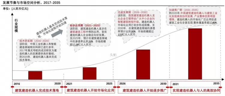 头豹研究院综合国家统计局、住建部数据预测的数据也显示,截至2021年,中国的建筑机器人市场渗透率不足1%,但已开始进入市场化应用阶段。预计到2025年,渗透率将达到10%,市场规模超过18亿人民币;到2030年,市场规模预计将超过113亿元人民币,渗透率可达50%;并且到2035年,市场规模可能达到224亿元人民币,渗透率超过80%,展现出快速增长的趋势。