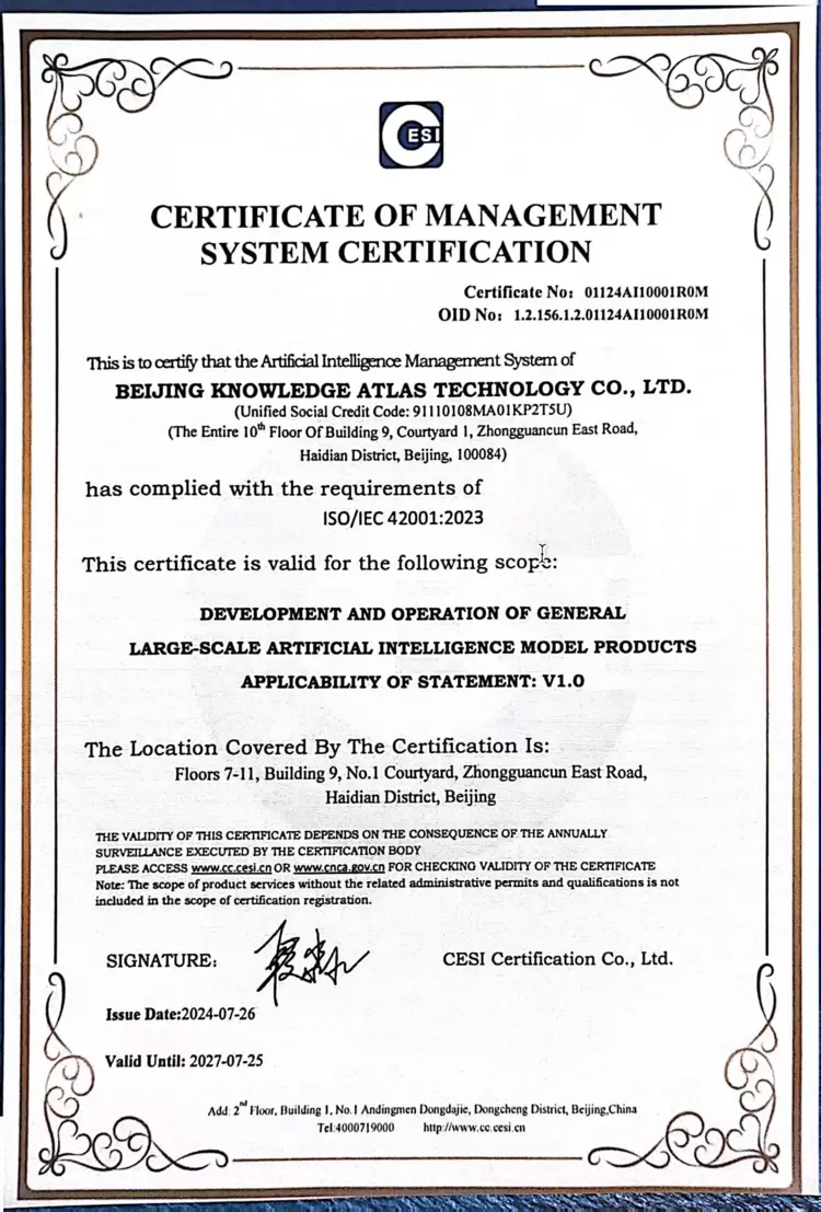 国内首批!智谱获颁ISO/IEC 42001:2023人工智能管理体系认证证书