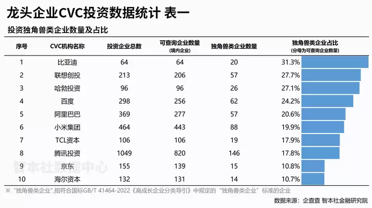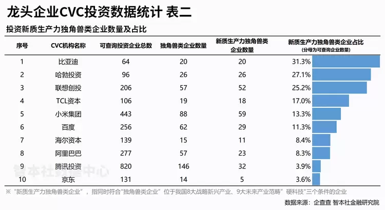 龙头企业CVC投资新质生产力独角兽类企业统计数据(表二)。(统计基于“8+9”领域的独角兽清单)