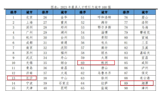 湖南省内,株洲和湘潭同样入围榜单,分列第60、89位,结合近三年榜单来看,在激烈的人才争夺战中,长沙整体吸引力不减的同时,株洲、湘潭排名有所上涨,在整体中部人才呈现持续流出的趋势下,更加凸显出长株潭城市群对于人才的整体吸引力在上升。