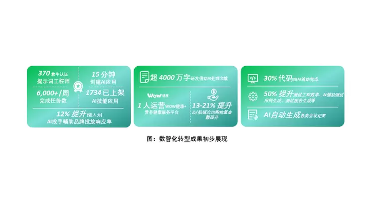完成上述步骤后,还需要从下往上把全民的生产力激发出来。因此,蒙牛内部举办了集团创新大赛,鼓励所有员工在各自领域内发掘场景需求并参与创新。同时,我们还实施了提示词工程师培训计划,目前已有大约370名员工通过了培训和考试,成为合格的提示词工程师。这些工程师平均每15分钟即可在公司的平台上创建一个新的应用卡片。公司通过积分奖励鼓励所有员工参与应用的创作与使用,从而让所有员工都能感受到AI的生产力。