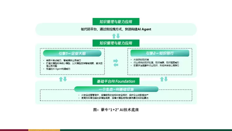 再往上是最关键的两个引擎。第一个引擎是知识银行,是企业内部沉淀的结构性、非结构性的所有数据。知识银行不只是有一个数据湖把数据放进去就行了,传统的要做数据的治理、数据的清洗,知识银行里面也是同样的,是有很多要求在里面的,要有不同主题的内容放进去。要自动把主题做关联,寻找知识的时候才不会遗漏,不会偏差。比如,企业有很多专有名词需要建立确立的索引,在知识银行里面,AI在寻找的时候可能需要一些索引去找到相关联的内容,比如文章里的内容有很多代词,蒙牛里面我们叫常温,常温既是常温奶,也是常温事业部,到底在什么情况下叫常温事业部什么时候是产品,都是有一定规则的,这些规则AI都要知道,才能更好的运作。同时,知识银行也需要做一些判断性的内容,比如用知识银行里面现有的东西做一些数据分析,想做一个季度的财务分析,是不是能够找得到,部分内容缺失,AI知不知道要去哪里找,这些都是企业知识银行所要具备的一些基本能力。这些能力当前并没有看到特别适用的开箱即用的产品,所以这一部分是在蒙牛内部进行自研,并对这个产品进行非常关键的打磨,所有以后越往上走的场景使用越跟这个知识银行的能力紧紧挂勾。