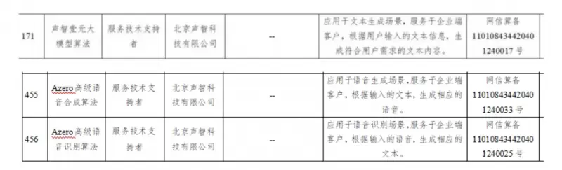 图 4:声智已经顺利完成“声智壹元大模型算法”“Azero高级语音识别算法”“Azero高级语音合成算法”三项深度合成服务算法备案,以及一项“声智壹元大模型”生成式人工智能服务备案。